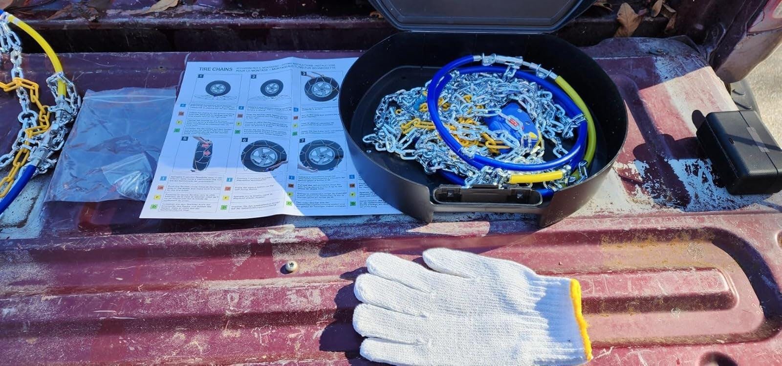 Living in the country, we have a hard time getting down our roads after a good snow and we will be the last roads to get cleared...I've used snow chains in the past and wore them out but they were a pain to put on so I opted to try these self-adjusting chains this time.